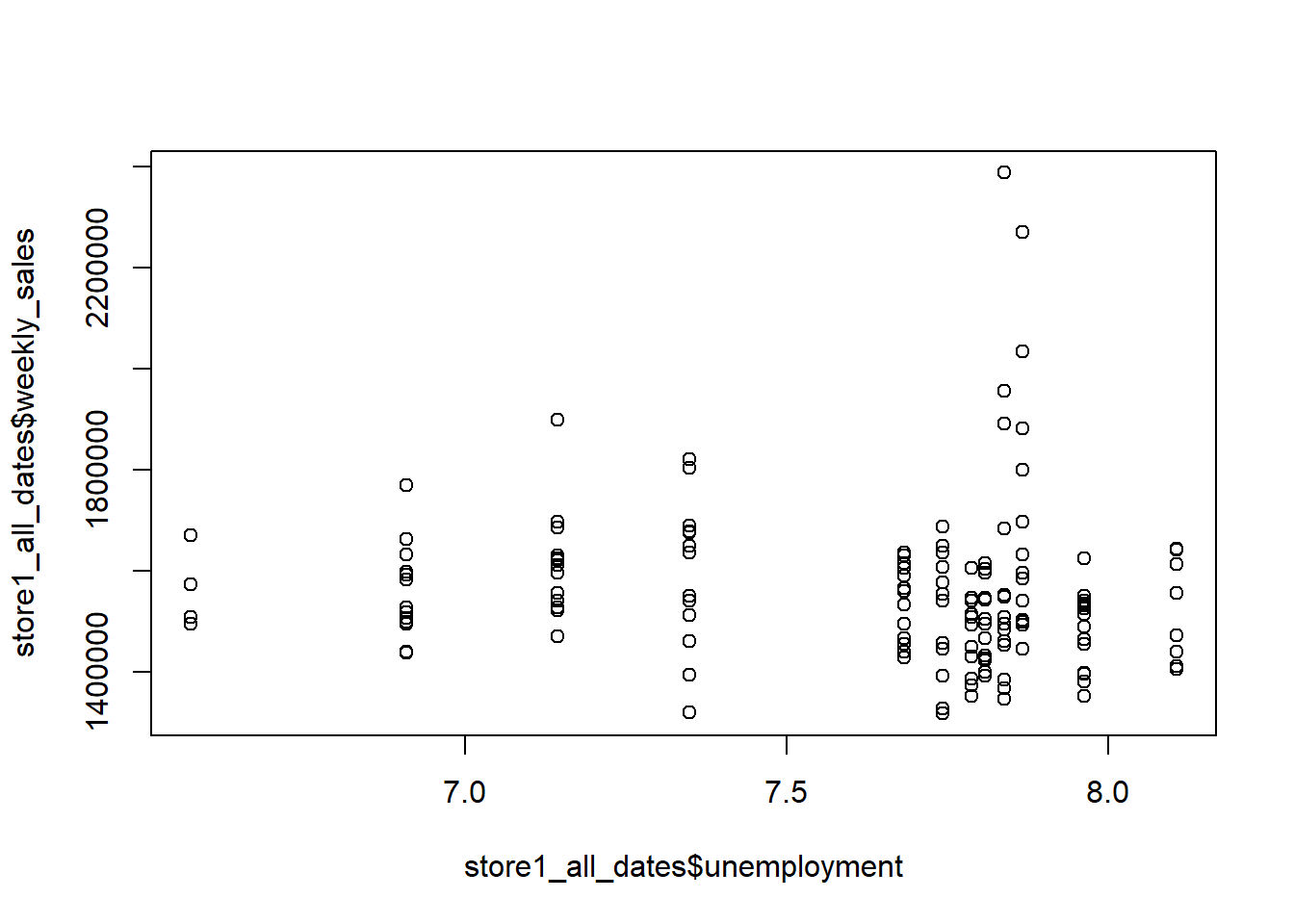 - Unemployment - across the various models that have been devised, the multiple linear regression has estimated both sales increases and decreases given a one unit increase in unemployment. My intuition tells me the more people that are unemployed in a society then the less discretionary spending there is. I would believe there is a negative linear relationship between unemployment and sales. I believe our model estimated any positive linear relationships based on their being more observations (and particularly high sales outliers) at greater levels of unemployment - see below.